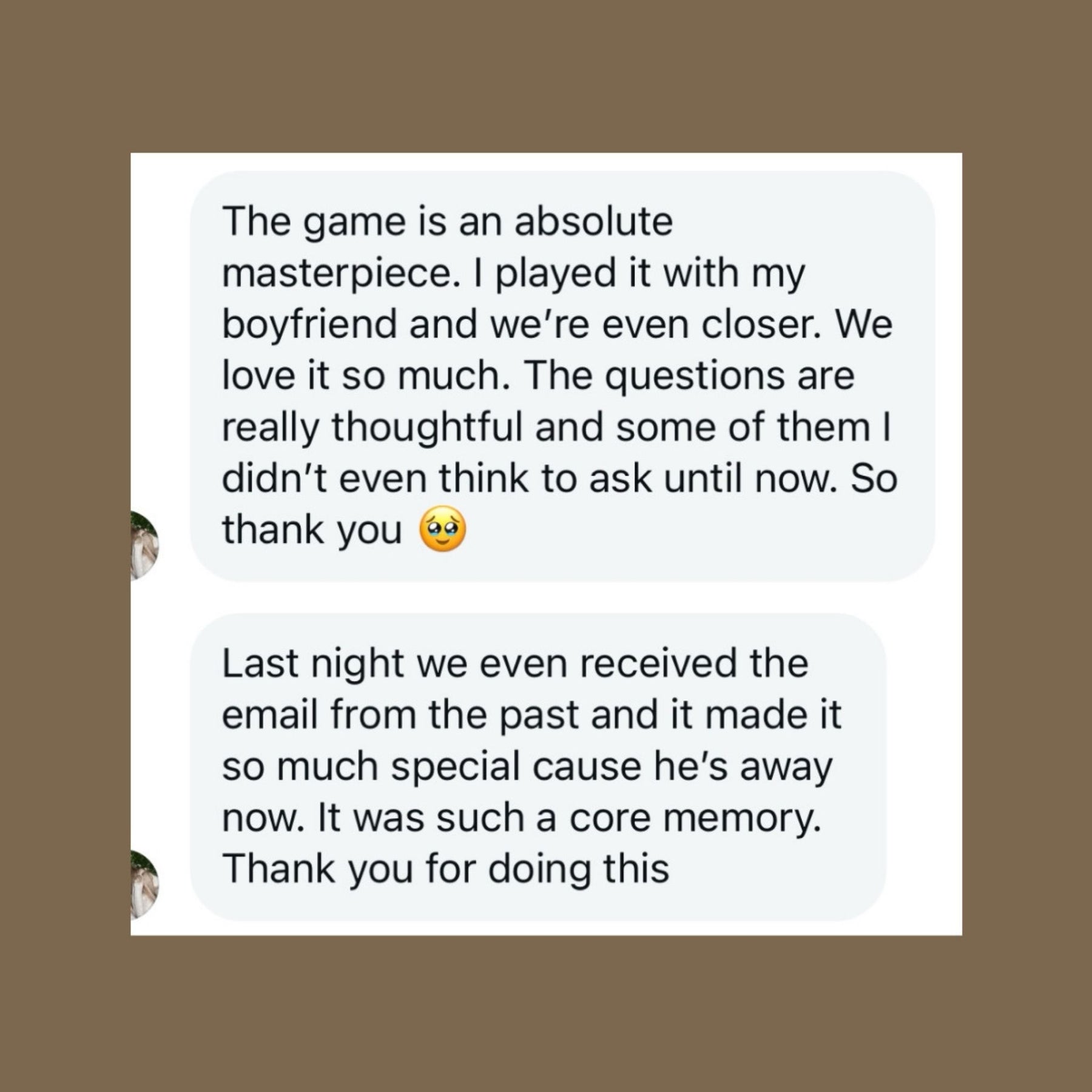 It made me realize there’s still so much I don’t know about him, even after living together. The questions pushed us to talk about things we hadn’t brought up before. Some were things I was nervous to ask, and I think he was nervous to answer, but the game made it easy to open up. It made me feel closer to him